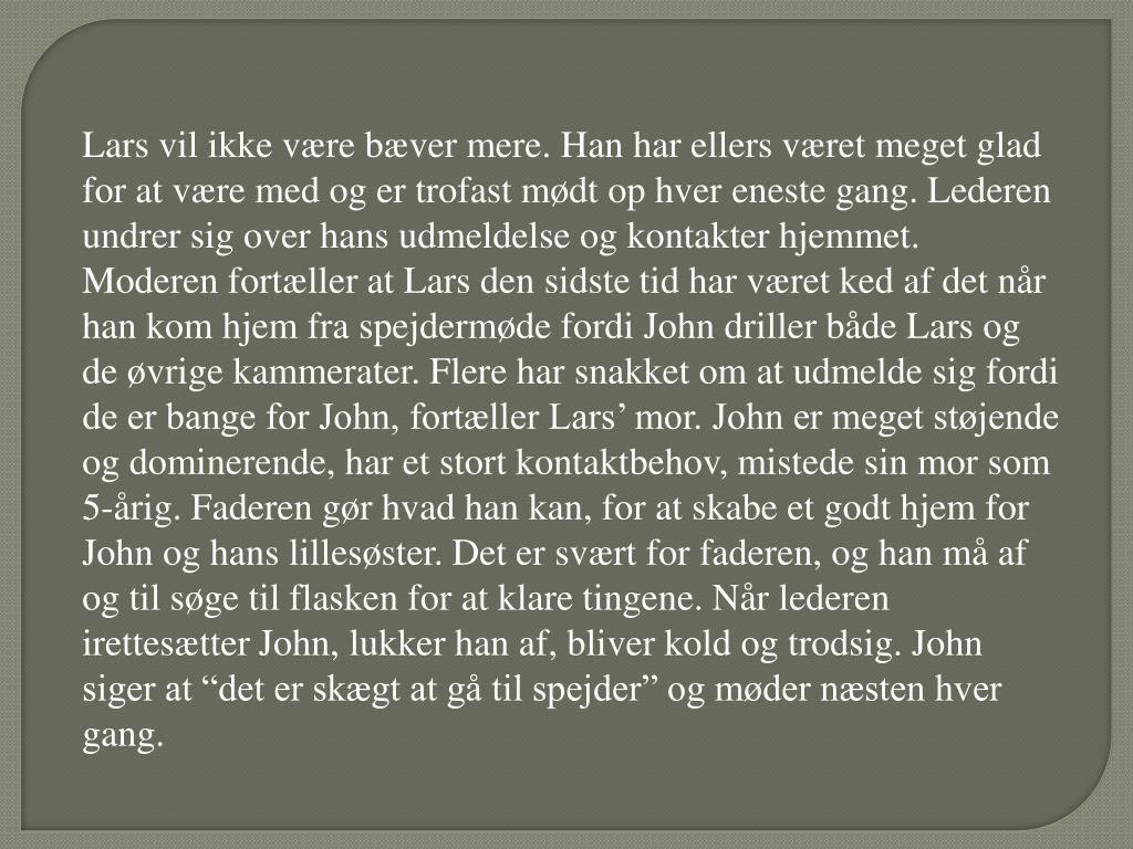 Lars vil ikke være bæver mere. Han har ellers været meget glad for at være med og er trofast mødt op hver eneste gang. Lederen undrer sig over hans udmeldelse og kontakter hjemmet. Moderen fortæller at Lars den sidste tid har været ked af det når han kom hjem fra spejdermøde fordi John driller både Lars og de øvrige kammerater. Flere har snakket om at udmelde sig fordi de er bange for John, fortæller Lars’ mor. John er meget støjende og dominerende, har et stort kontaktbehov, mistede sin mor som 5-årig. Faderen gør hvad han kan, for at skabe et godt hjem for John og hans lillesøster. Det er svært for faderen, og han må af og til søge til flasken for at klare tingene. Når lederen irettesætter John, lukker han af, bliver kold og trodsig. John siger at “det er skægt at gå til spejder” og møder næsten hver gang.