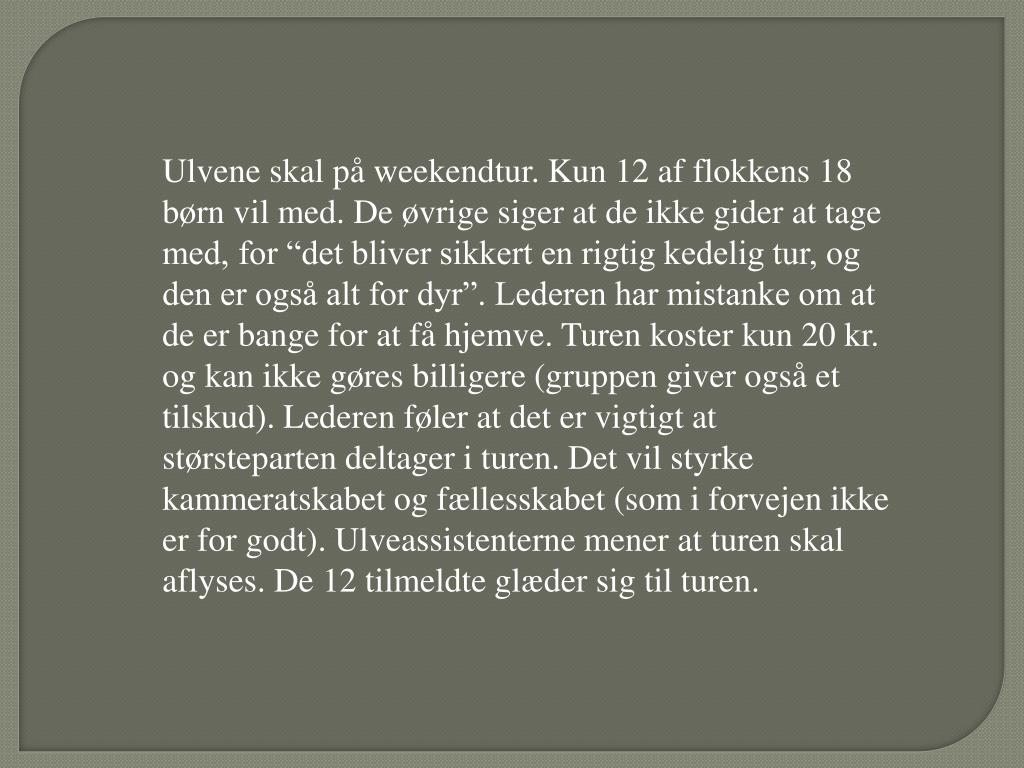 Ulvene skal på weekendtur. Kun 12 af flokkens 18 børn vil med. De øvrige siger at de ikke gider at tage med, for “det bliver sikkert en rigtig kedelig tur, og den er også alt for dyr”. Lederen har mistanke om at de er bange for at få hjemve. Turen koster kun 20 kr. og kan ikke gøres billigere (gruppen giver også et tilskud). Lederen føler at det er vigtigt at størsteparten deltager i turen. Det vil styrke kammeratskabet og fællesskabet (som i forvejen ikke er for godt). Ulveassistenterne mener at turen skal aflyses. De 12 tilmeldte glæder sig til turen.