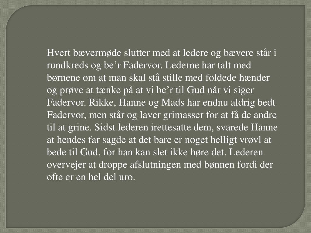Hvert bævermøde slutter med at ledere og bævere står i rundkreds og be’r Fadervor. Lederne har talt med børnene om at man skal stå stille med foldede hænder og prøve at tænke på at vi be’r til Gud når vi siger Fadervor. Rikke, Hanne og Mads har endnu aldrig bedt Fadervor, men står og laver grimasser for at få de andre til at grine. Sidst lederen irettesatte dem, svarede Hanne at hendes far sagde at det bare er noget helligt vrøvl at bede til Gud, for han kan slet ikke høre det. Lederen overvejer at droppe afslutningen med bønnen fordi der ofte er en hel del uro.