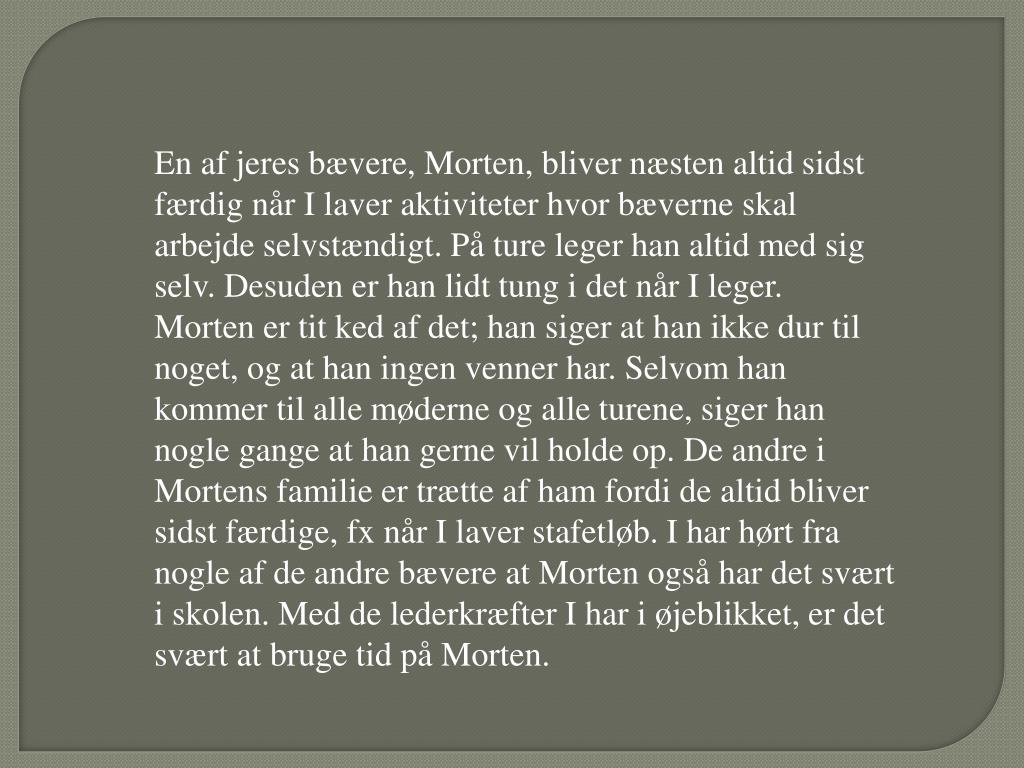 En af jeres bævere, Morten, bliver næsten altid sidst færdig når I laver aktiviteter hvor bæverne skal arbejde selvstændigt. På ture leger han altid med sig selv. Desuden er han lidt tung i det når I leger. • Morten er tit ked af det; han siger at han ikke dur til noget, og at han ingen venner har. Selvom han kommer til alle møderne og alle turene, siger han nogle gange at han gerne vil holde op. De andre i Mortens familie er trætte af ham fordi de altid bliver sidst færdige, fx når I laver stafetløb. I har hørt fra nogle af de andre bævere at Morten også har det svært i skolen. Med de lederkræfter I har i øjeblikket, er det svært at bruge tid på Morten.