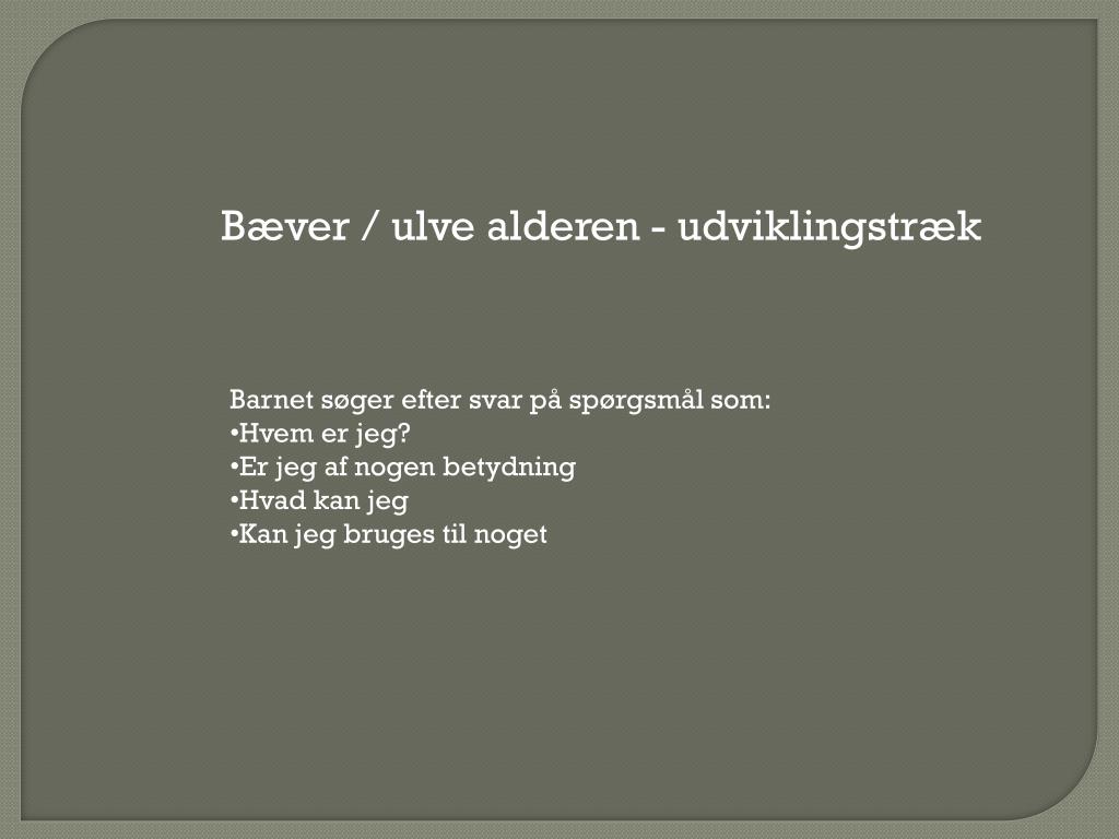 Bæver / ulve alderen - udviklingstræk • Barnet søger efter svar på spørgsmål som: • Hvem er jeg? • Er jeg af nogen betydning • Hvad kan jeg • Kan jeg bruges til noget