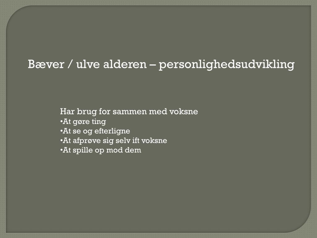 Bæver / ulve alderen – personlighedsudvikling • Har brug for sammen med voksne • At gøre ting • At se og efterligne • At afprøve sig selv ift voksne • At spille op mod dem