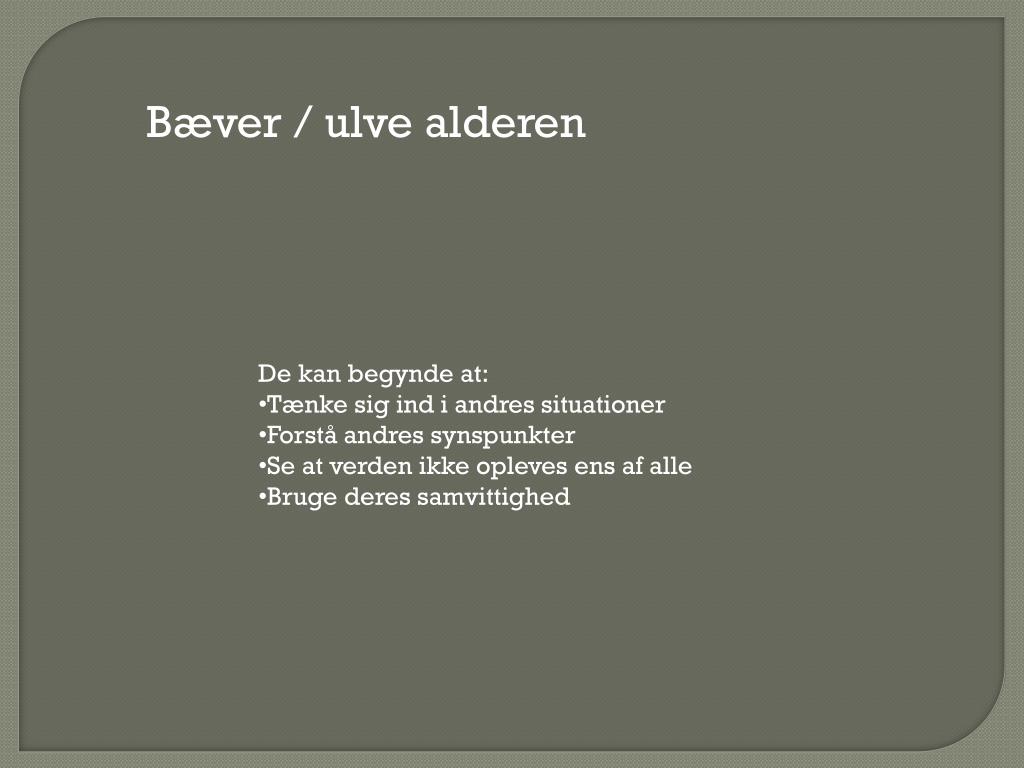 Bæver / ulve alderen • De kan begynde at: • Tænke sig ind i andres situationer • Forstå andres synspunkter • Se at verden ikke opleves ens af alle • Bruge deres samvittighed