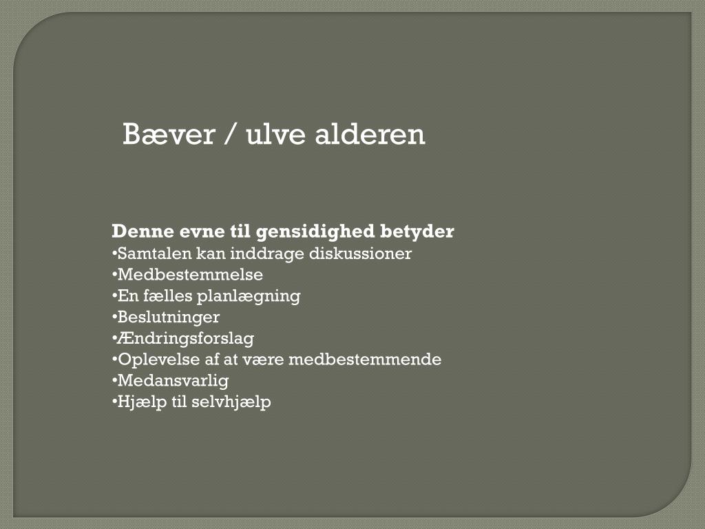 Bæver / ulve alderen • Denne evne til gensidighed betyder • Samtalen kan inddrage diskussioner • Medbestemmelse • En fælles planlægning • Beslutninger • Ændringsforslag • Oplevelse af at være medbestemmende • Medansvarlig • Hjælp til selvhjælp