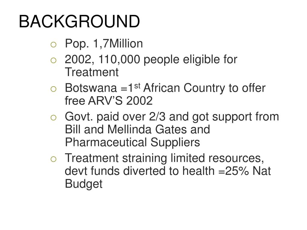 BACKGROUND • Pop. 1,7Million • 2002, 110,000 people eligible for Treatment • Botswana =1st African Country to offer free ARV’S 2002 • Govt. paid over 2/3 and got support from Bill and Mellinda Gates and Pharmaceutical Suppliers • Treatment straining limited resources, devt funds diverted to health =25% Nat Budget
