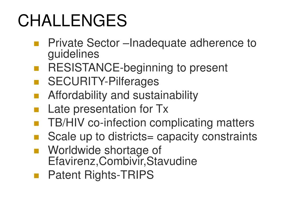 CHALLENGES • Private Sector –Inadequate adherence to guidelines • RESISTANCE-beginning to present • SECURITY-Pilferages • Affordability and sustainability • Late presentation for Tx • TB/HIV co-infection complicating matters • Scale up to districts= capacity constraints • Worldwide shortage of Efavirenz,Combivir,Stavudine • Patent Rights-TRIPS