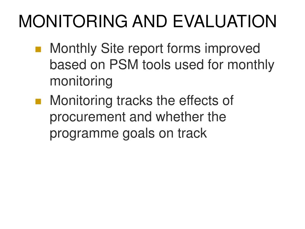 MONITORING AND EVALUATION • Monthly Site report forms improved based on PSM tools used for monthly monitoring • Monitoring tracks the effects of procurement and whether the programme goals on track