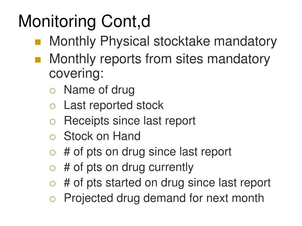 Monitoring Cont,d • Monthly Physical stocktake mandatory • Monthly reports from sites mandatory covering: • Name of drug • Last reported stock • Receipts since last report • Stock on Hand • # of pts on drug since last report • # of pts on drug currently • # of pts started on drug since last report • Projected drug demand for next month