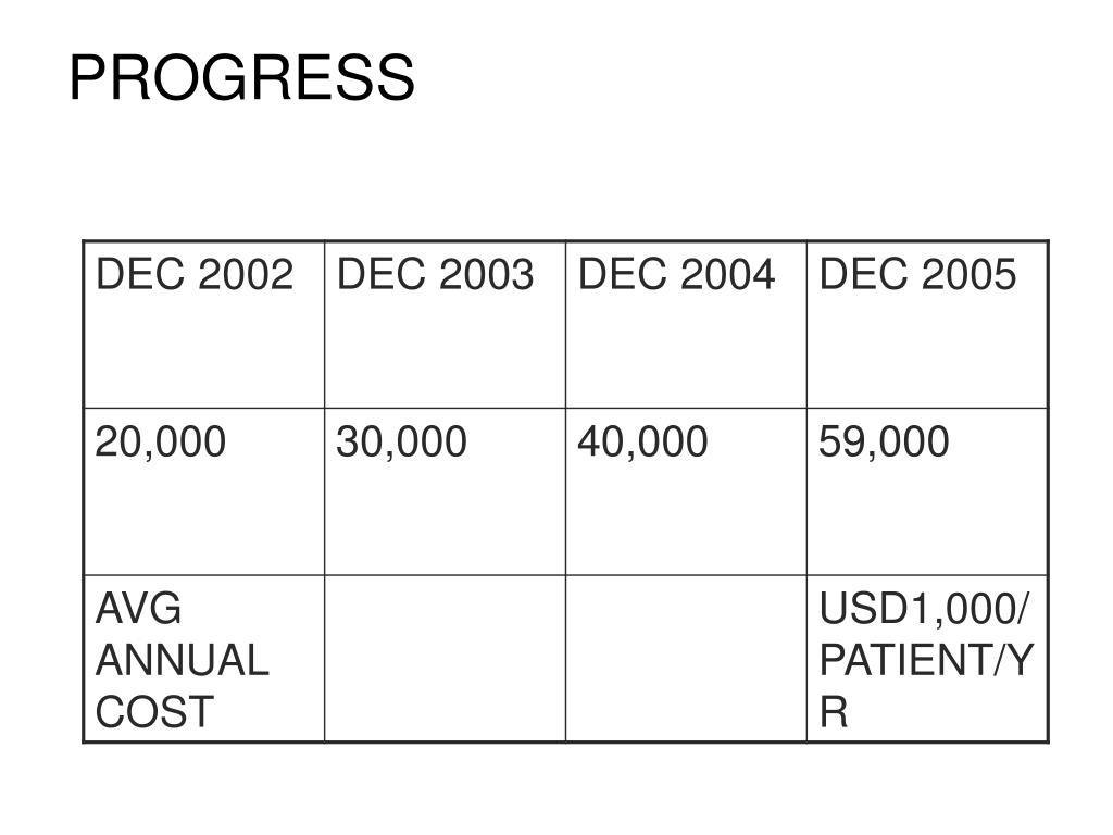 PROGRESS SO FAR • 2002 • 110,000 HIV+ Needed treatment • 4 SITES • 7,000 PATIENTS initiated on treatment • P50Million (USD 10M) used • 2004/05 • 32 Sites • 37,500 patients on Tx by April 05 we estimate 59,000(52,000 Govt. and 7,300 Pvt.) by Dec 05 ( Ref :55,000 required per 3x5 by Dec05) • Monthly enrolment rate of 1000-2,000 patients • P200 Million(USD 45M) spent during 2004/05
