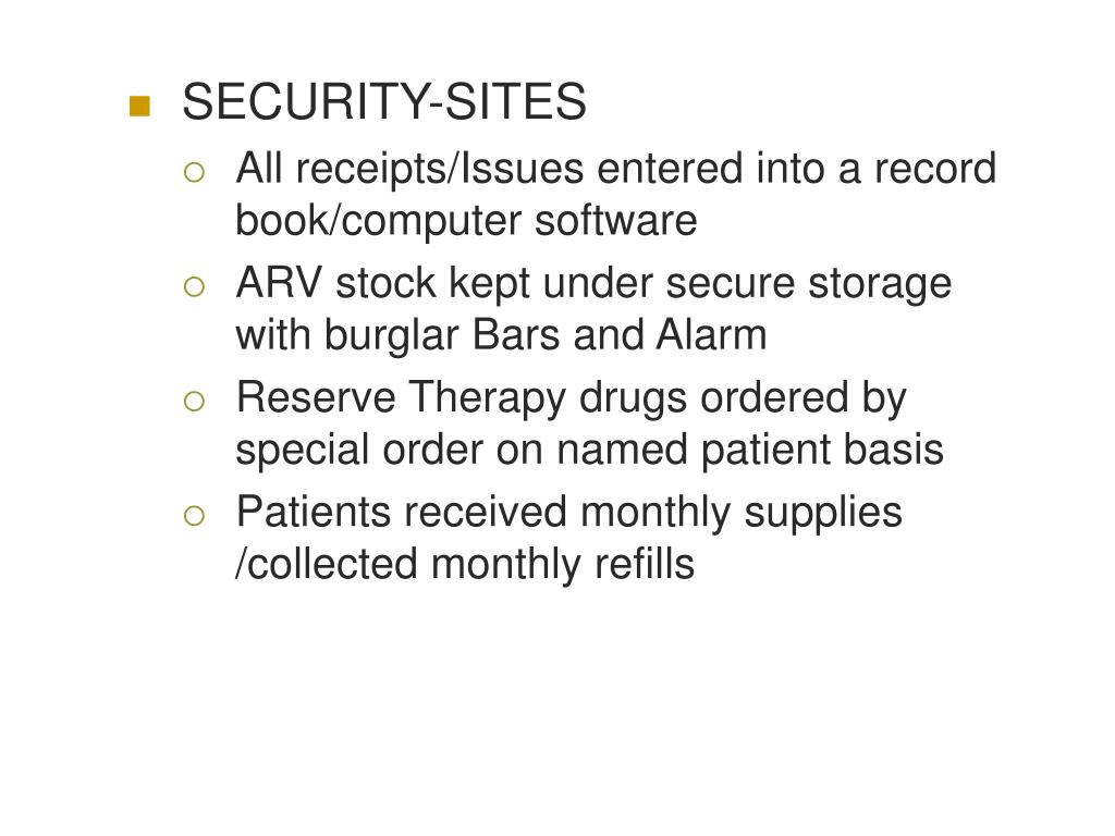 SECURITY-SITES • All receipts/Issues entered into a record book/computer software • ARV stock kept under secure storage with burglar Bars and Alarm • Reserve Therapy drugs ordered by special order on named patient basis • Patients received monthly supplies /collected monthly refills