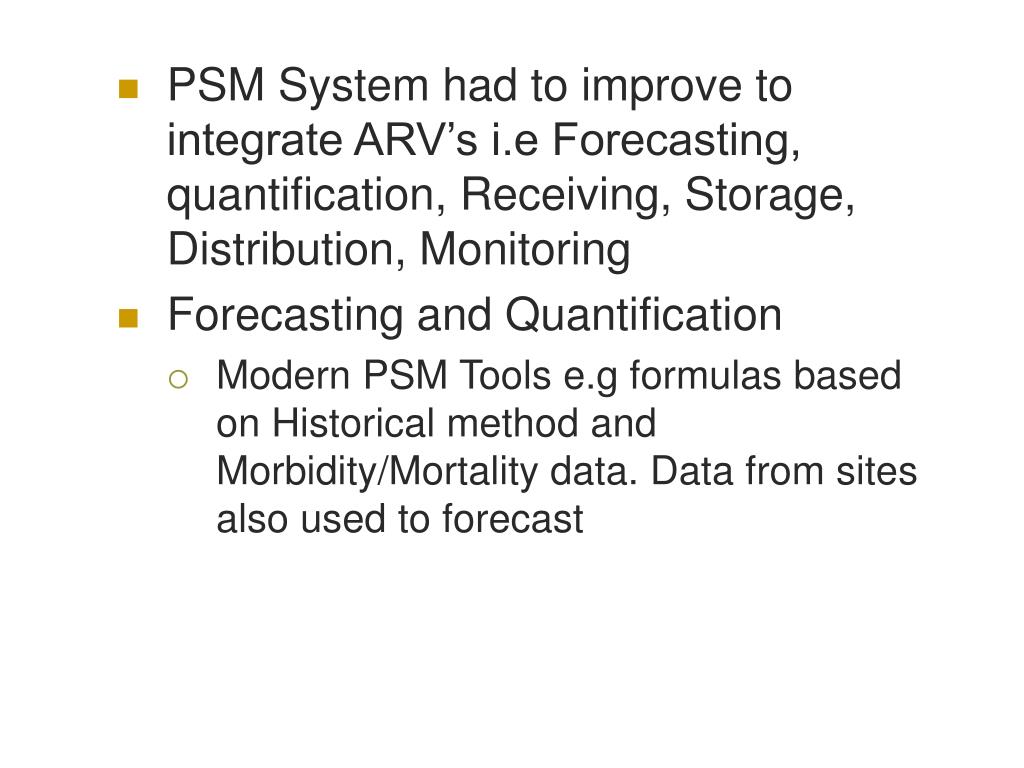 PSM System had to improve to integrate ARV’s i.e Forecasting, quantification, Receiving, Storage, Distribution, Monitoring • Forecasting and Quantification • Modern PSM Tools e.g formulas based on Historical method and Morbidity/Mortality data. Data from sites also used to forecast