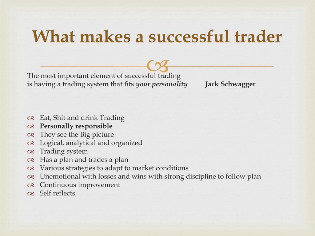 What makes a successful trader The most important element of successful trading is having a trading system that fits your personality Jack Schwagger • Eat, Shit and drink Trading • Personally responsible • They see the Big picture • Logical, analytical and organized • Trading system • Has a plan and trades a plan • Various strategies to adapt to market conditions • Unemotional with losses and wins with strong discipline to follow plan • Continuous improvement • Self reflects