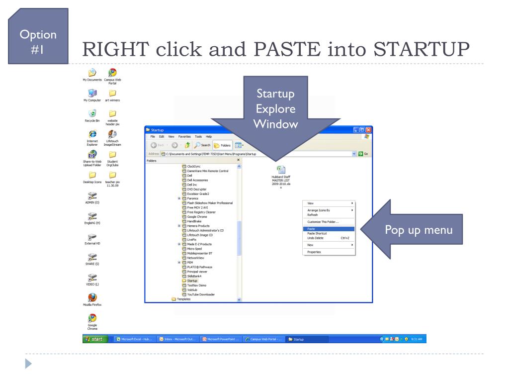 Option #1 RIGHT click and PASTE into STARTUP Startup Explore Window Pop up menu