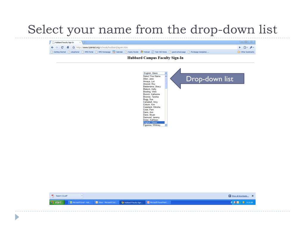 Don’t forget To sign in. Hubbard Faculty Web Based Sign In. Tips on Quick Access and Setting Reminders. Begin at the Hubbard Portal Page…. Sign-in Link. Navigate to the sign-in page. Select your name from the drop-down list. Drop-down list. Click the sign-in button. Confirmation page.