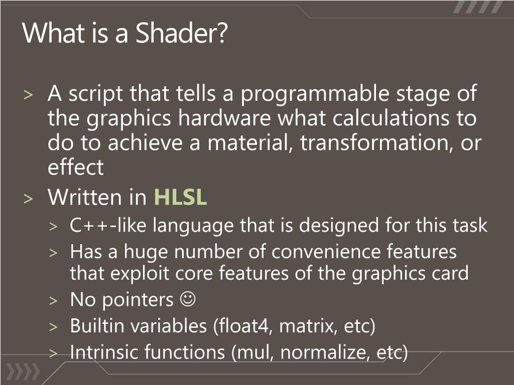 What is a Shader? • A script that tells a programmable stage of the graphics hardware what calculations to do to achieve a material, transformation, or effect • Written in HLSL • C++-like language that is designed for this task • Has a huge number of convenience features that exploit core features of the graphics card • No pointers • Builtin variables (float4, matrix, etc) • Intrinsic functions (mul, normalize, etc)