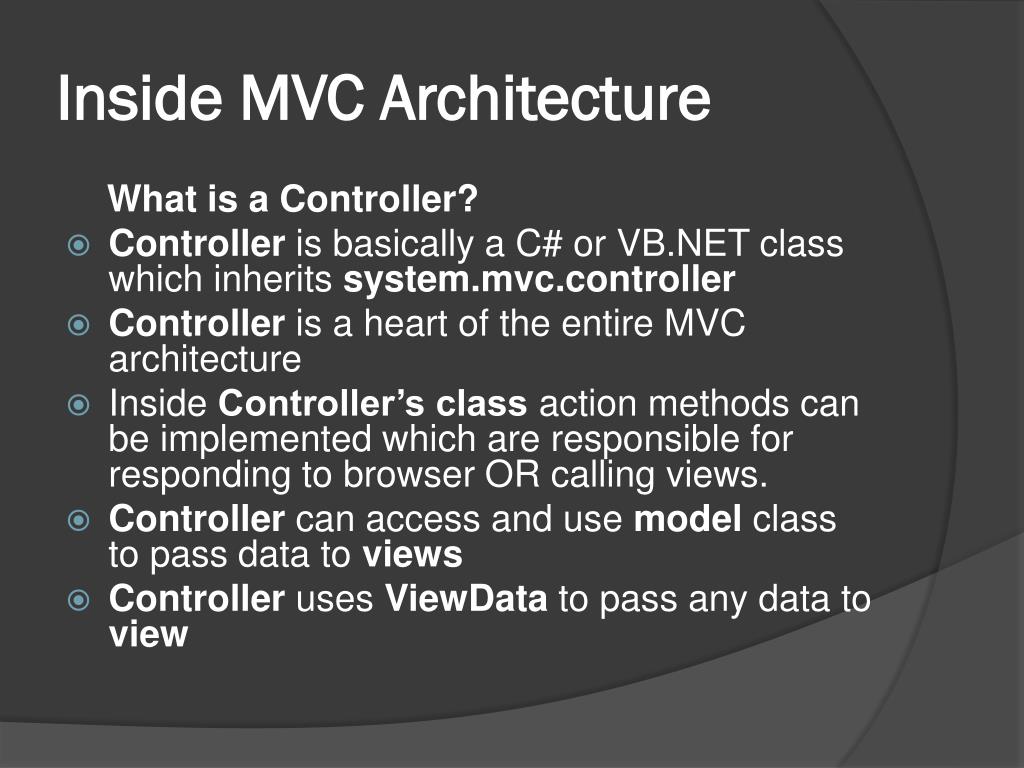 Inside MVC Architecture What is a Controller? • Controller is basically a C# or VB.NET class which inherits system.mvc.controller • Controller is a heart of the entire MVC architecture • Inside Controller’s class action methods can be implemented which are responsible for responding to browser OR calling views. • Controller can access and use model class to pass data to views • Controller uses ViewDatato pass any data to view