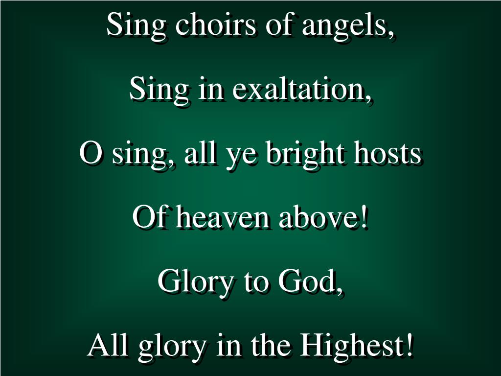 Sing choirs of angels, Sing in exaltation, O sing, all ye bright hosts Of heaven above! Glory to God, All glory in the Highest!