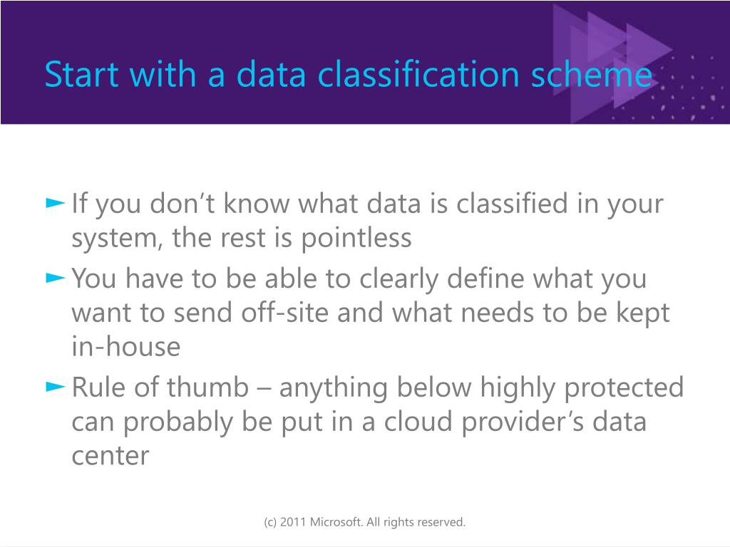 Start with a data classification scheme • If you don’t know what data is classified in your system, the rest is pointless • You have to be able to clearly define what you want to send off-site and what needs to be kept in-house • Rule of thumb – anything below highly protected can probably be put in a cloud provider’s data center (c) 2011 Microsoft. All rights reserved.