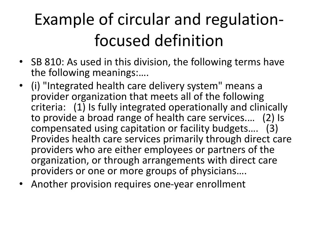 Example of circular and regulation-focused definition • SB 810: As used in this division, the following terms have the following meanings:…. • (i) "Integrated health care delivery system" means a provider organization that meets all of the following criteria: (1) Is fully integrated operationally and clinically to provide a broad range of health care services.… (2) Is compensated using capitation or facility budgets…. (3) Provides health care services primarily through direct care providers who are either employees or partners of the organization, or through arrangements with direct care providers or one or more groups of physicians…. • Another provision requires one-year enrollment