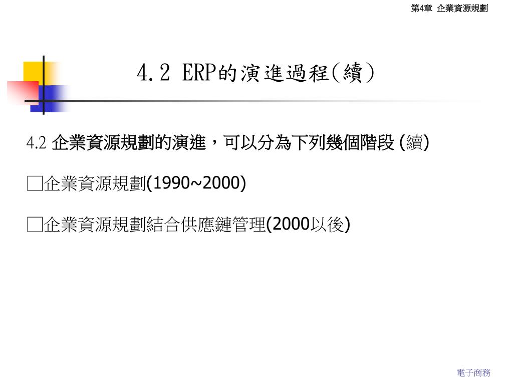 第4章 企業資源規劃 4.2 ERP的演進過程(續) 4.2企業資源規劃的演進,可以分為下列幾個階段(續) □企業資源規劃(1990~2000) □企業資源規劃結合供應鏈管理(2000以後) 電子商務