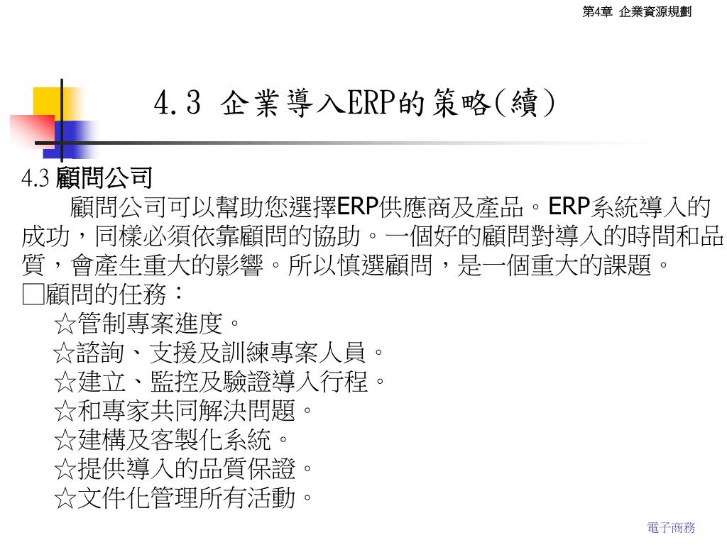 第4章 企業資源規劃 4.3 企業導入ERP的策略(續) 4.3 要成功導入ERP系統,有許多關鍵要素 ☆顧問的專業水準,以及良好的溝通能力。 ☆企業經理人對ERP導入與時程配合的決心。 ☆企業與外部客戶及廠商的溝通。 ☆系統導入文件製作。 電子商務