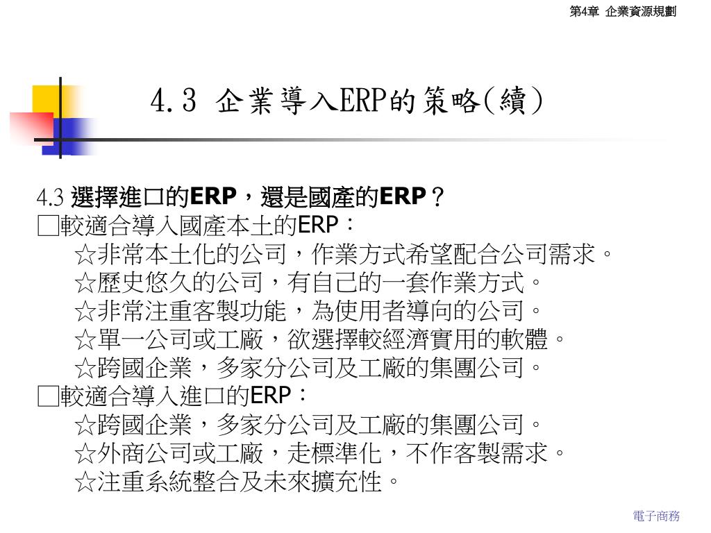 第4章 企業資源規劃 4.3 企業導入ERP的策略(續) 4.3 選擇進口的ERP,還是國產的ERP? □較適合導入國產本土的ERP: ☆非常本土化的公司,作業方式希望配合公司需求。 ☆歷史悠久的公司,有自己的一套作業方式。 ☆非常注重客製功能,為使用者導向的公司。 ☆單一公司或工廠,欲選擇較經濟實用的軟體。 ☆跨國企業,多家分公司及工廠的集團公司。 □較適合導入進口的ERP: ☆跨國企業,多家分公司及工廠的集團公司。 ☆外商公司或工廠,走標準化,不作客製需求。 ☆注重系統整合及未來擴充性。 電子商務