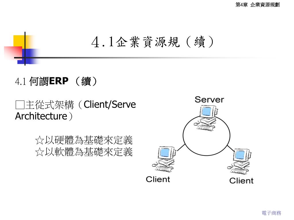 第4章 企業資源規劃 4.1企業資源規(續) 4.1 何謂ERP(續) □主從式架構(Client/Serve Architecture) ☆以硬體為基礎來定義 ☆以軟體為基礎來定義 電子商務