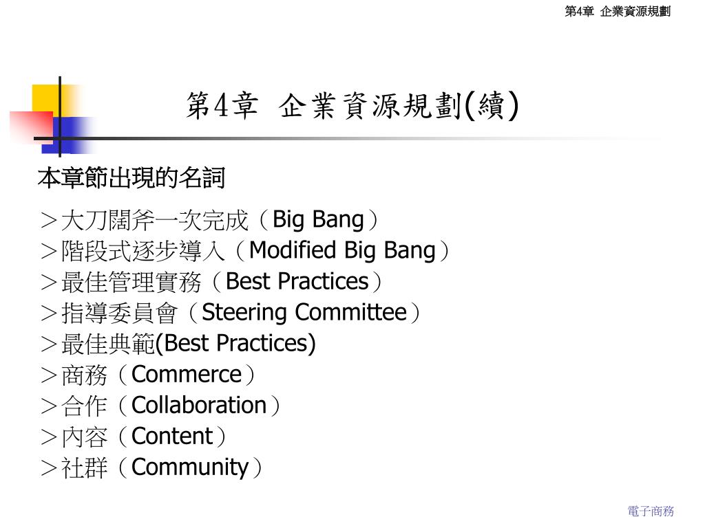 第4章 企業資源規劃 第4章 企業資源規劃(續) 本章節出現的名詞 >大刀闊斧一次完成(Big Bang) >階段式逐步導入(Modified Big Bang) >最佳管理實務(Best Practices) >指導委員會(Steering Committee) >最佳典範(Best Practices) >商務(Commerce) >合作(Collaboration) >內容(Content) >社群(Community) 電子商務