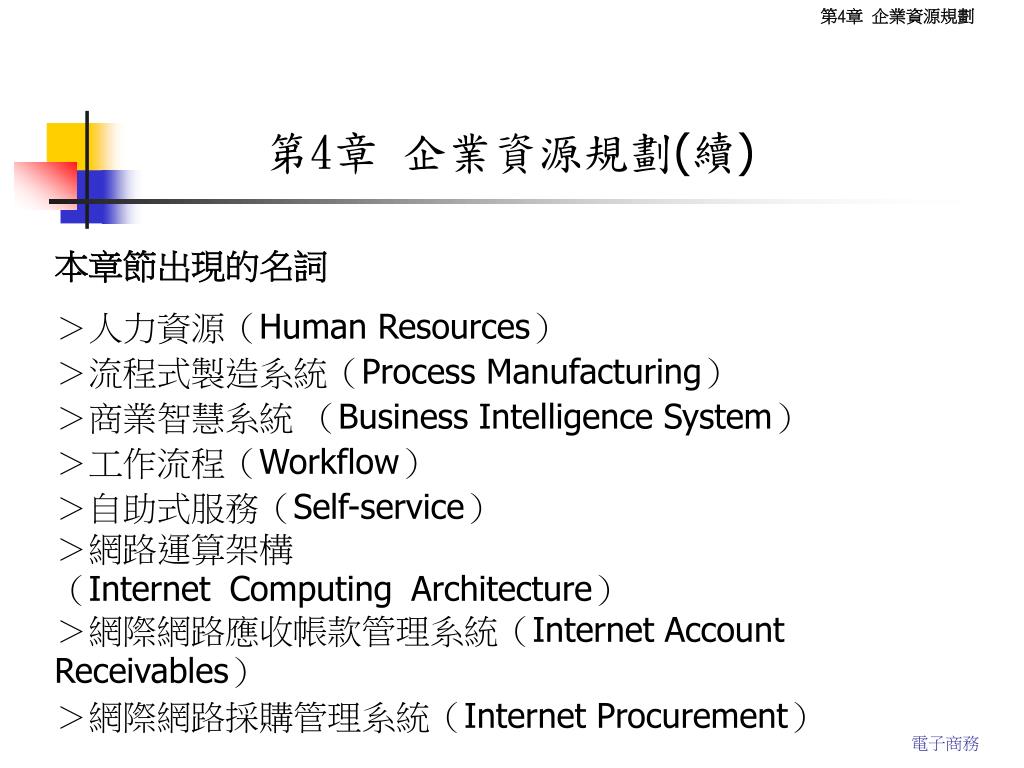 第4章 企業資源規劃 第4章 企業資源規劃(續) 本章節出現的名詞 >人力資源(Human Resources) >流程式製造系統(Process Manufacturing) >商業智慧系統 (Business Intelligence System) >工作流程(Workflow) >自助式服務(Self-service) >網路運算架構 (Internet Computing Architecture) >網際網路應收帳款管理系統(Internet Account Receivables) >網際網路採購管理系統(Internet Procurement) 電子商務