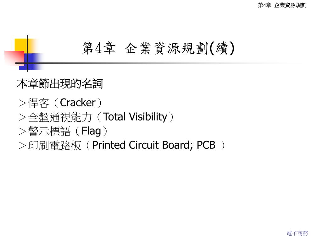 第4章 企業資源規劃 第4章 企業資源規劃(續) 本章節出現的名詞 >悍客(Cracker) >全盤通視能力(Total Visibility) >警示標語(Flag) >印刷電路板(Printed Circuit Board; PCB ) 電子商務