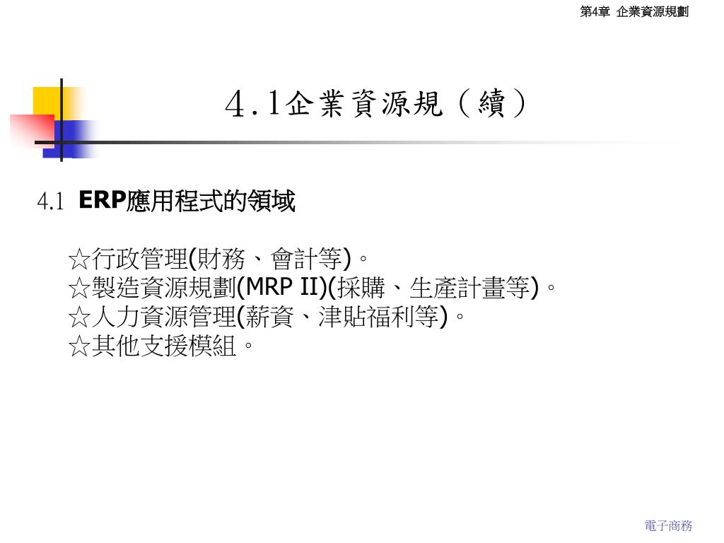 第4章 企業資源規劃 4.1企業資源規(續) 4.1 ERP應用程式的領域 ☆行政管理(財務、會計等)。 ☆製造資源規劃(MRP II)(採購、生產計畫等)。 ☆人力資源管理(薪資、津貼福利等)。 ☆其他支援模組。 電子商務