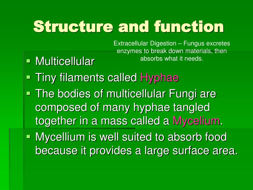 Structure and function Extracellular Digestion – Fungus excretes enzymes to break down materials, then absorbs what it needs. • Multicellular • Tiny filaments called Hyphae • The bodies of multicellular Fungi are composed of many hyphae tangled together in a mass called a Mycelium. • Mycellium is well suited to absorb food because it provides a large surface area.