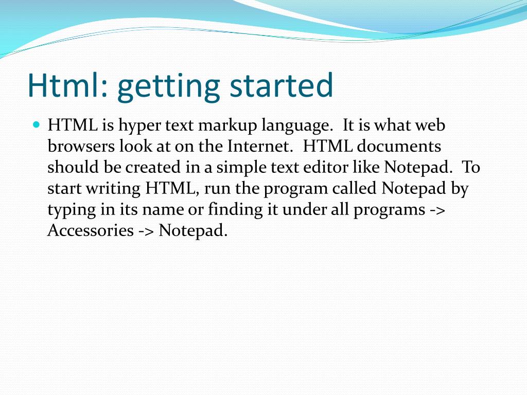 Html: getting started • HTML is hyper text markup language. It is what web browsers look at on the Internet. HTML documents should be created in a simple text editor like Notepad. To start writing HTML, run the program called Notepad by typing in its name or finding it under all programs -> Accessories -> Notepad.