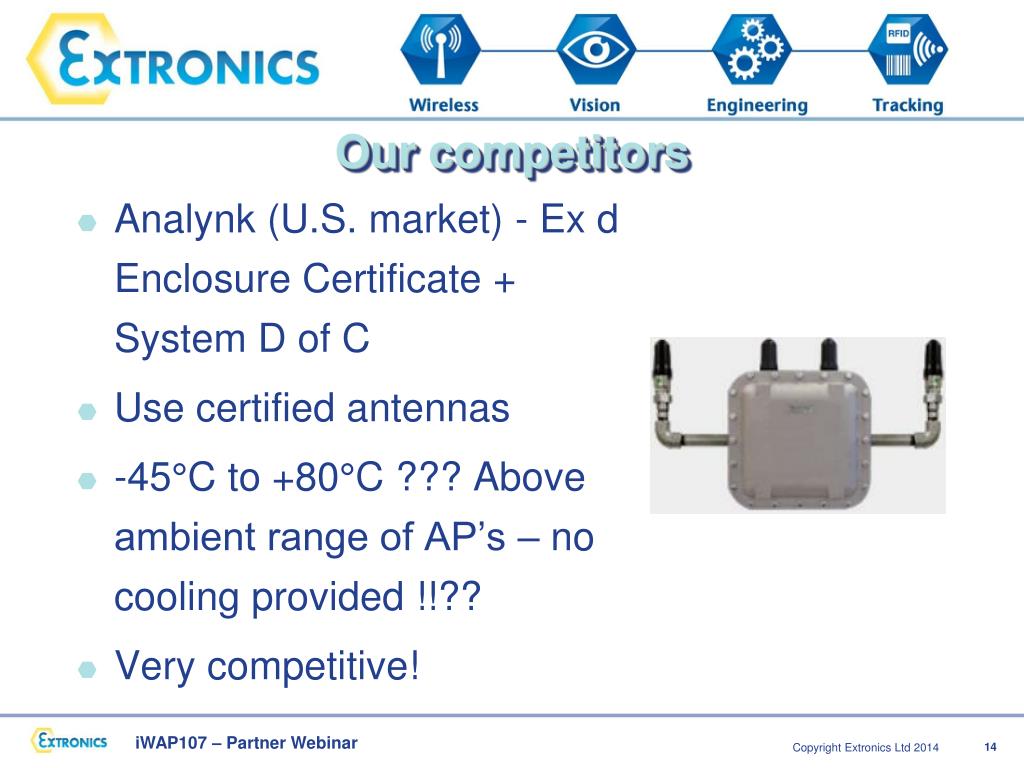 Our competitors • Analynk (U.S. market) - Ex d Enclosure Certificate + System D of C • Use certified antennas • -45°C to +80°C ??? Above ambient range of AP’s – no cooling provided !!?? • Very competitive!