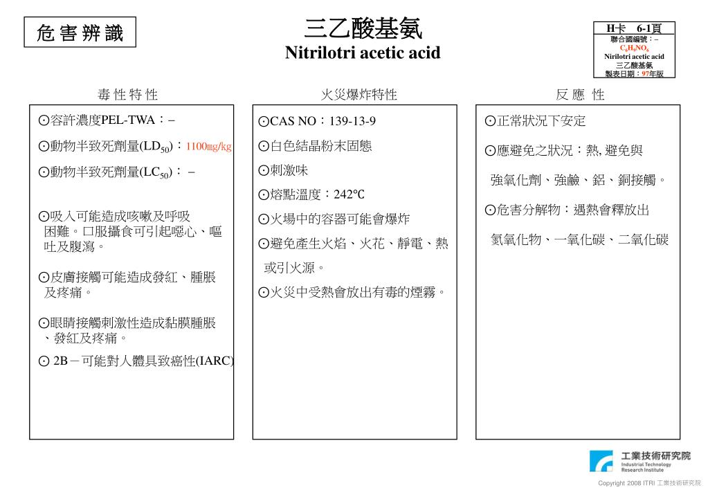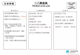 H 卡 6-1 頁 聯合國編號: – C 6 H 9 NO 6 Nirilotri acetic acid 三乙酸基氨 製表日期: 97 年版. 三乙酸基氨 Nitrilotri acetic acid. 危 害 辨 識. 毒 性 特 性. 火災爆炸特性. 反 應 性. ⊙ 正常狀況下安定 ⊙應避免之狀況:熱 , 避免與 強氧化劑、強鹼、鋁、銅接觸。 ⊙危害分解物:遇熱會釋放出 氮氧化物、一氧化碳、二氧化碳. ⊙ 容許濃度 PEL-TWA : ⊙動物半致死劑量 (LD 50 ) : 1100㎎/㎏