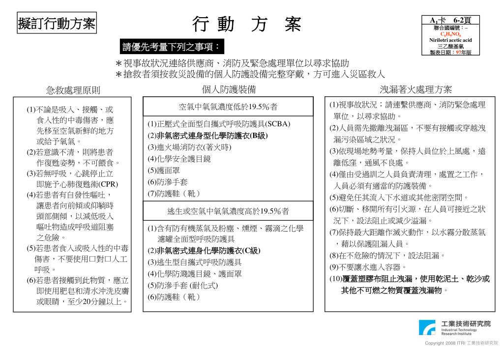 A1卡 6-2頁 聯合國編號:– C6H9NO6 Nirilotri acetic acid 三乙酸基氨 製表日期:97年版 行 動 方 案 擬訂行動方案 請優先考量下列之事項: *視事故狀況連絡供應商、消防及緊急處理單位以尋求協助 *搶救者須按救災設備的個人防護設備完整穿戴,方可進入災區救人 個人防護裝備 洩漏著火處理方案 急救處理原則 空氣中氧氣濃度低於19.5%者 (1)視事故狀況;請連繫供應商、消防緊急處理 單位,以尋求協助。 (2)人員需先撤離洩漏區,不要有接觸或穿越洩 漏污染區域之狀況。 (3)依現場地勢考量,保持人員位於上風處,遠 離低窪,通風不良處。 (4)僅由受過訓之人員負責清理,處置之工作, 人員必須有適當的防護裝備。 (5)避免任其流入下水道或其他密閉空間。 (6)切斷、移開所有引火源,在人員可接近之狀 況下,設法阻止或減少溢漏。 (7)保持最大距離作滅火動作,以水霧分散蒸氣 ,藉以保護阻漏人員。 (8)在不危險的情況下,設法阻漏。 (9)不要讓水進入容器。 (10)覆蓋塑膠布阻止洩漏,使用乾泥土、乾沙或 其他不可燃之物質覆蓋洩漏物。 (1)不論是吸入、接觸、或 食入性的中毒傷害,應 先移至空氣新鮮的地方 或給予氧氣。 (2)若意識不清,則將患者 作復甦姿勢,不可餵食。 (3)若無呼吸,心跳停止立 即施予心肺復甦術(CPR) (4)若患者有自發性嘔吐, 讓患者向前傾或仰躺時 頭部側傾,以減低吸入 嘔吐物造成呼吸道阻塞 之危險。 (5)若患者食入或吸入性的中毒 傷害,不要使用口對口人工 呼吸。 (6)若患者接觸到此物質,應立 即使用肥皂和清水沖洗皮膚 或眼睛,至少20分鐘以上。 (1)正壓式全面型自攜式呼吸防護具(SCBA) (2)非氣密式連身型化學防護衣(B級) (3)進火場消防衣(著火時) (4)化學安全護目鏡 (5)護面罩 (6)防滲手套 (7)防護鞋(靴) 逃生或空氣中氧氣濃度高於19.5%者 (1)含有防有機蒸氣及粉塵、燻煙、霧滴之化學濾罐全面型呼吸防護具 (2)非氣密式連身化學防護衣(C級) (3)逃生型自攜式呼吸防護具 (4)化學防濺護目鏡、護面罩 (5)防滲手套 (耐化式) (6)防護鞋(靴)