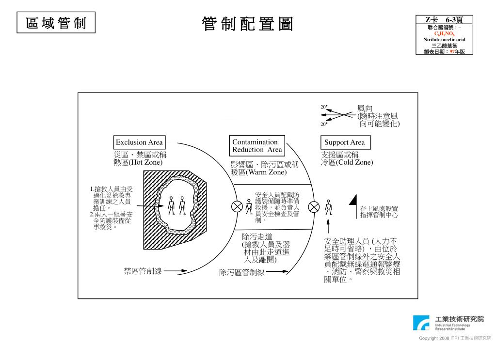Z卡 6-3頁 聯合國編號:– C6H9NO6 Nirilotri acetic acid 三乙酸基氨 製表日期:97年版 風向 20 (隨時注意風 向可能變化) 20 Contamination Exclusion Area Support Area Reduction Area 災區、禁區或稱 支援區或稱 熱區(Hot Zone) 冷區(Cold Zone) 影響區、除污區或稱 暖區(Warm Zone) 1.搶救人員由受 安全人員配戴防 過化災搶救專 護裝備隨時準備 業訓練之人員 救援,並負責人 擔任。 在上風處設置 員安全檢查及管 2.兩人一組著安 指揮管制中心 制。 全防護裝備從 事救災。 除污走道 安全助理人員 (人力不 (搶救人員及器 足時可省略) ,由位於 材由此走道進 禁區管制線外之安全人 入及離開) 員配戴無線電通報醫療 禁區管制線 、消防、警察與救災相 除污區管制線 關單位。 管 制 配 置 圖 區 域 管 制