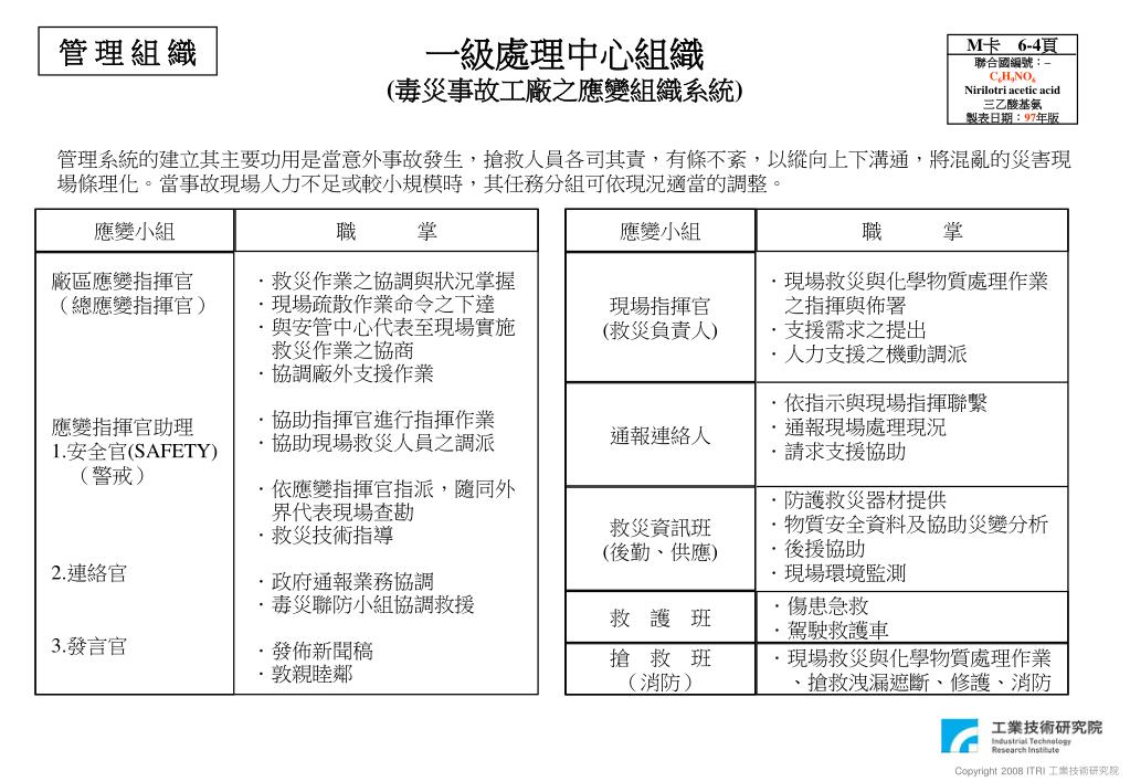 M卡 6-4頁 聯合國編號:– C6H9NO6 Nirilotri acetic acid 三乙酸基氨 製表日期:97年版 一級處理中心組織 (毒災事故工廠之應變組織系統) 管 理 組 織 管理系統的建立其主要功用是當意外事故發生,搶救人員各司其責,有條不紊,以縱向上下溝通,將混亂的災害現 場條理化。當事故現場人力不足或較小規模時,其任務分組可依現況適當的調整。 應變小組 職 掌 應變小組 職 掌 現場指揮官 (救災負責人) 廠區應變指揮官 (總應變指揮官) 應變指揮官助理 1.安全官(SAFETY) (警戒) 2.連絡官 3.發言官 .現場救災與化學物質處理作業 之指揮與佈署 .支援需求之提出 .人力支援之機動調派 .依指示與現場指揮聯繫 .通報現場處理現況 .請求支援協助 .防護救災器材提供 .物質安全資料及協助災變分析 .後援協助 .現場環境監測 .救災作業之協調與狀況掌握 .現場疏散作業命令之下達 .與安管中心代表至現場實施 救災作業之協商 .協調廠外支援作業 .協助指揮官進行指揮作業 .協助現場救災人員之調派 .依應變指揮官指派,隨同外 界代表現場查勘 .救災技術指導 .政府通報業務協調 .毒災聯防小組協調救援 .發佈新聞稿 .敦親睦鄰 通報連絡人 救災資訊班 (後勤、供應) 救 護 班 .傷患急救 .駕駛救護車 搶 救 班 (消防) .現場救災與化學物質處理作業 、搶救洩漏遮斷、修護、消防