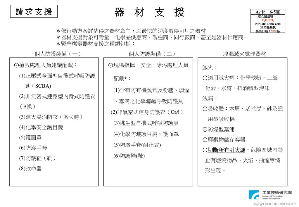 A2卡 6-5頁 聯合國編號:– C6H9NO6 Nirilotri acetic acid 三乙酸基氨 製表日期:97年版 器 材 支 援 請 求 支 援 *依行動方案評估得之器材為主,以最快的速度取得可用之器材 *器材支援對象可考量:化學品供應商、製造商、同行廠商、甚至是器材供應商 *緊急應變器材支援之種類包括: 個人防護裝備(一) 個人防護裝備(二) 洩漏滅火處理器材 ⊙現場指揮、安全、除污處理人員 配戴*: (1)含有防有機蒸氣及粉塵、燻煙 、霧滴之化學濾罐呼吸防護具 (2)非氣密式連身防護衣(C級) (3)逃生型自攜式呼吸防護具 (4)化學防濺護目鏡、護面罩 (5)防滲手套(耐化式) (6)防護鞋(靴) ⊙搶救處理人員建議配戴: (1)正壓式全面型自攜式呼吸防護 具(SCBA) (2)非氣密式連身型內背式防護衣 (B級) (3)進火場消防衣(著火時) (4)化學安全護目鏡 (5)護面罩 (6)防滲手套 (7)防護鞋(靴) (8)救命器 滅火: ⊙適用滅火劑:化學乾粉、二氧 化碳、水霧、抗酒精型泡沫 洩漏: ⊙吸收體:木屑、活性炭、砂及通 用型吸收棉 ⊙防爆型幫浦 ⊙廢棄物儲存容器 ⊙切斷所有引火源,危險區域內禁 止有燃燒物品、火焰、抽煙等情 形出現。