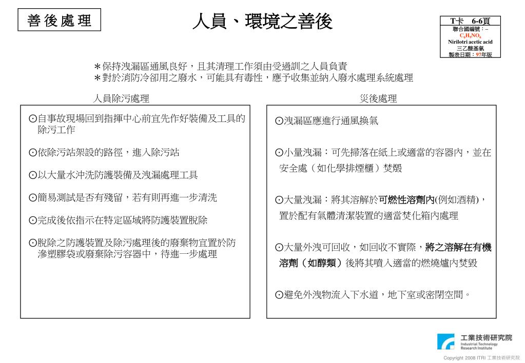 T卡 6-6頁 聯合國編號:– C6H9NO6 Nirilotri acetic acid 三乙酸基氨 製表日期:97年版 人員、環境之善後 善 後 處 理 *保持洩漏區通風良好,且其清理工作須由受過訓之人員負責 *對於消防冷卻用之廢水,可能具有毒性,應予收集並納入廢水處理系統處理 人員除污處理 災後處理 ⊙自事故現場回到指揮中心前宜先作好裝備及工具的 除污工作 ⊙依除污站架設的路徑,進入除污站 ⊙以大量水沖洗防護裝備及洩漏處理工具 ⊙簡易測試是否有殘留,若有則再進一步清洗 ⊙完成後依指示在特定區域將防護裝置脫除 ⊙脫除之防護裝置及除污處理後的廢棄物宜置於防 滲塑膠袋或廢棄除污容器中,待進一步處理 ⊙洩漏區應進行通風換氣 ⊙小量洩漏:可先掃落在紙上或適當的容器內,並在 安全處(如化學排煙櫃)焚燬 ⊙大量洩漏:將其溶解於可燃性溶劑內(例如酒精), 置於配有氣體清潔裝置的適當焚化箱內處理 ⊙大量外洩可回收,如回收不實際,將之溶解在有機 溶劑(如醇類)後將其噴入適當的燃燒爐內焚毀 ⊙避免外洩物流入下水道,地下室或密閉空間。