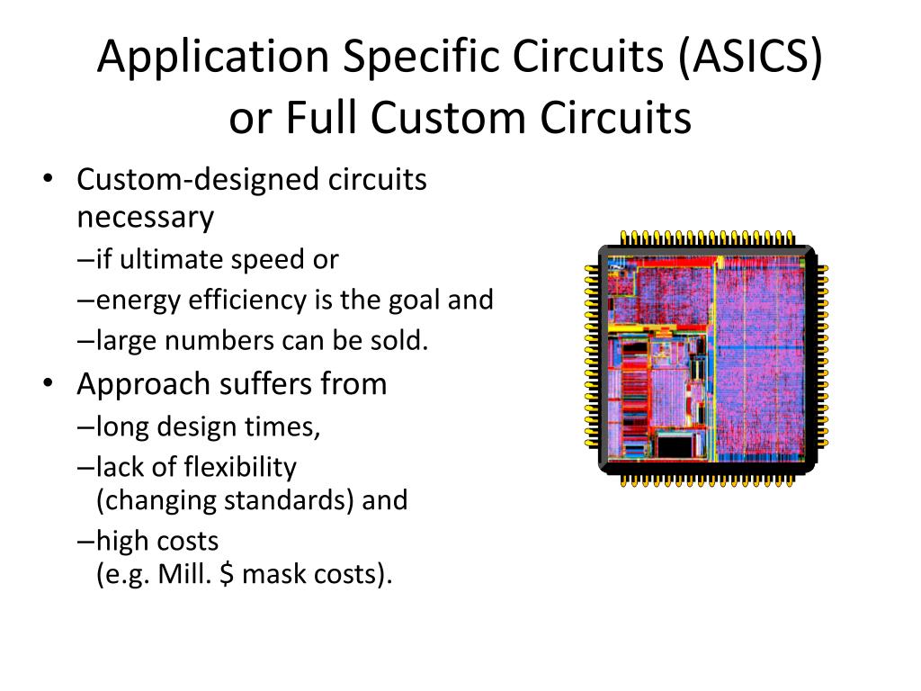 Application Specific Circuits (ASICS)or Full Custom Circuits • Custom-designed circuits necessary • if ultimate speed or • energy efficiency is the goal and • large numbers can be sold. • Approach suffers from • long design times, • lack of flexibility(changing standards) and • high costs(e.g. Mill. $ mask costs).