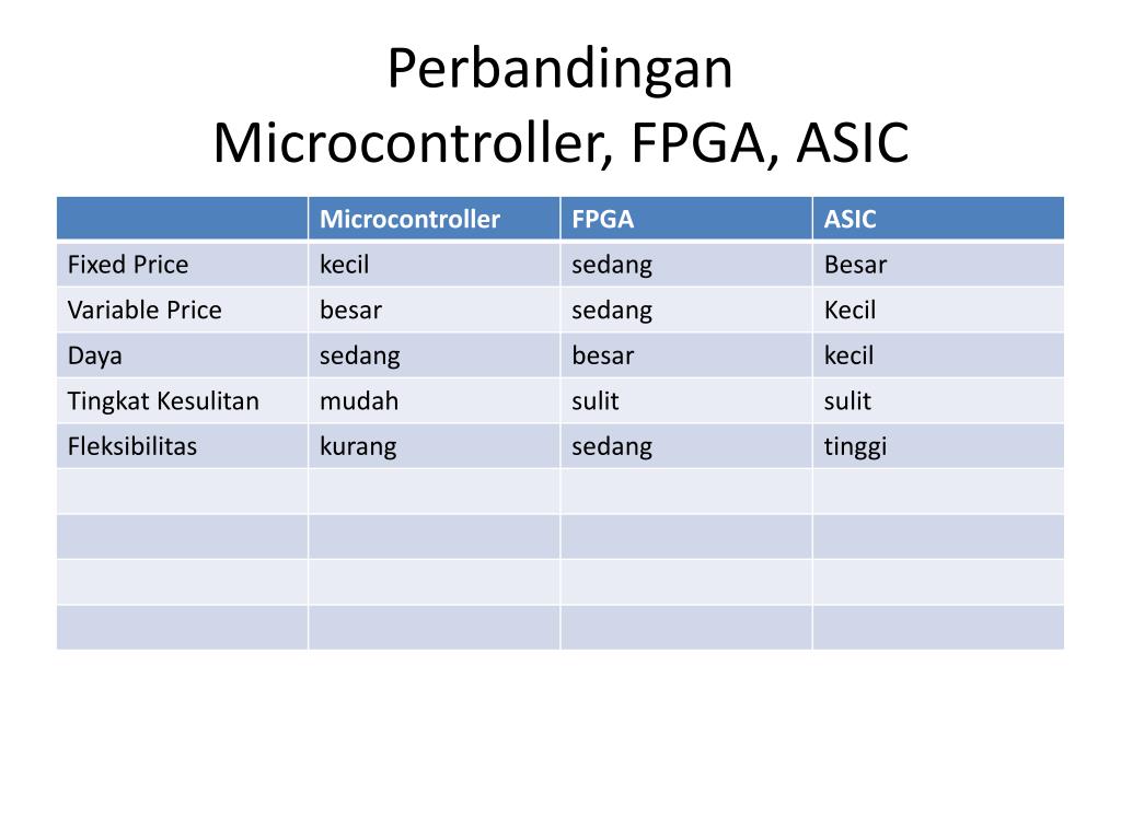 ASIC vs FPGA Summary: • An ASIC is a unique type of integrated circuit meant for a specific application while an FPGA is a reprogrammable integrated circuit. • An ASIC can no longer be altered once created while an FPGA can. • It is common practice to design and test on an FPGA before implementing on an ASIC. • An ASIC wastes very little material compared to an FPGA and the recurring costs are low. • FPGA is better than an ASIC when building low volume production circuits. • Sumber: http://www.differencebetween.net/technology/difference-between-asic-and-fpga/