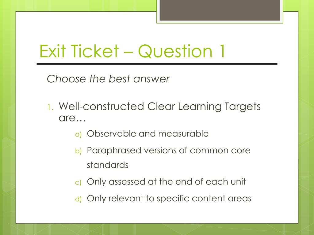 Exit Ticket – Question 1 Choose the best answer • Well-constructed Clear Learning Targets are… • Observable and measurable • Paraphrased versions of common core standards • Only assessed at the end of each unit • Only relevant to specific content areas
