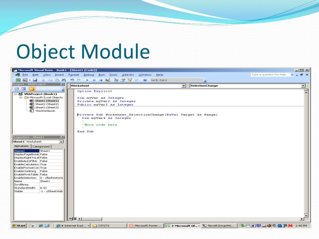 Storing and Modifying Information • Object and Standard Modules • Module refers to a related set of declarations and procedures • Each Module will have a separate window in the VBA IDE • Depending on the origination will have different behavior with regard to variable declaration • An object module is associated with an object • The Worksheet object • The module automatically contains all the event procedures associated with wooksheet … worksheet1