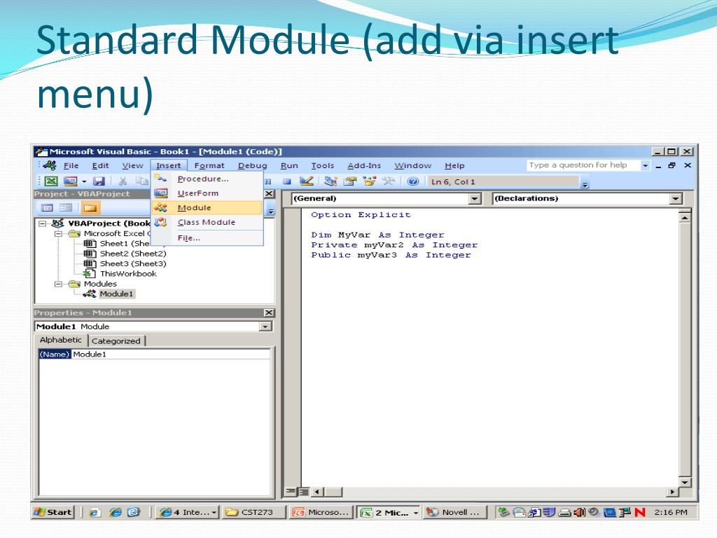 Storing and Modifying Information ‘ A constant that is only used for conditional compilation ‘You can’t define this as Public or Private, VBA hides the ‘value from other modules #Const Debug_ = “false” ‘This constant is visible to other modules Public Const MyPublicConstant = “Hello” ‘This constant is visible only to this module Private Const MyPrivateConstant = “Hello”