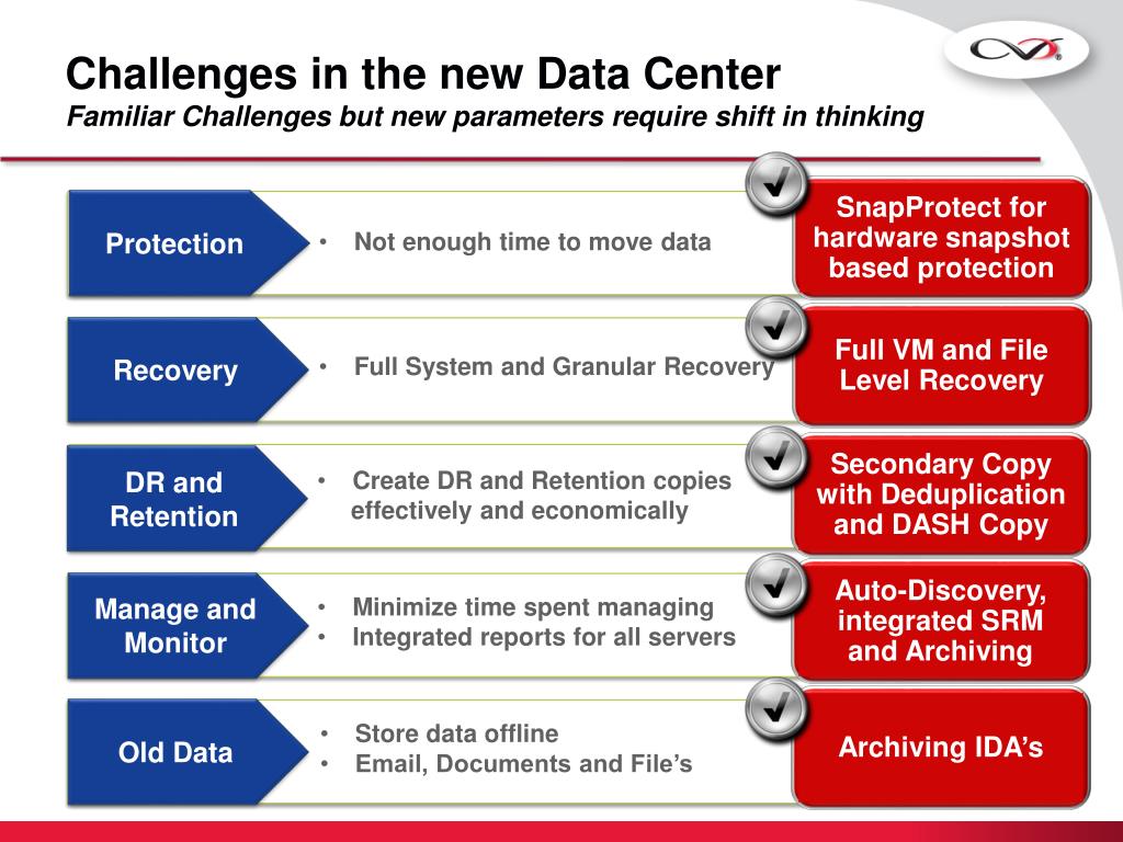 SnapProtect for hardware snapshot based protection Challenges in the new Data CenterFamiliar Challenges but new parameters require shift in thinking • Full VM and File Level Recovery Protection • Not enough time to move data • Secondary Copy with Deduplication and DASH Copy Recovery • Full System and Granular Recovery • Auto-Discovery, integrated SRM and Archiving DR and Retention • Create DR and Retention copies effectively and economically • Archiving IDA’s Manage and Monitor • Minimize time spent managing • Integrated reports for all servers Old Data • Store data offline • Email, Documents and File’s
