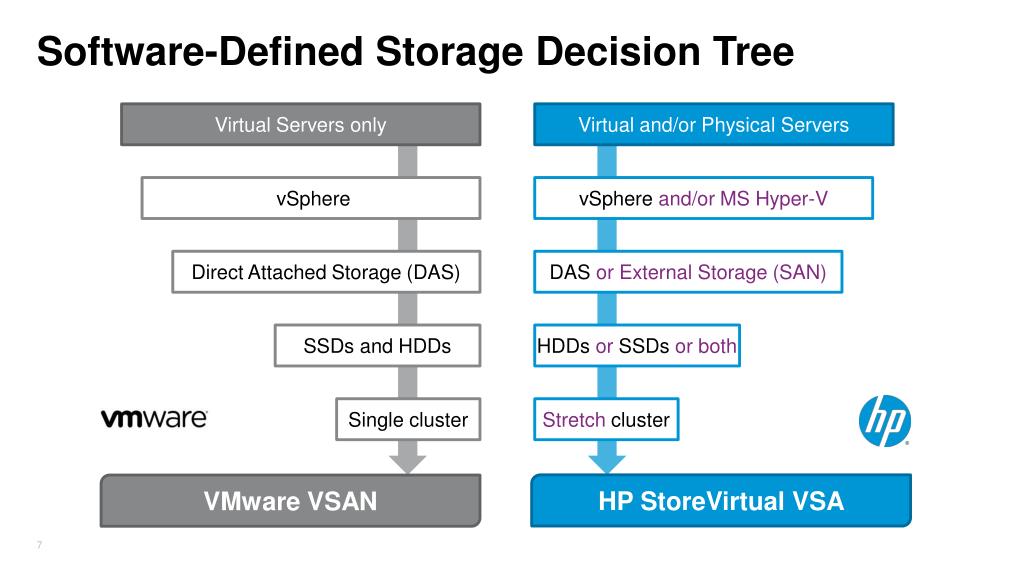 Software-Defined Storage Decision Tree Virtual Servers only Virtual and/or Physical Servers vSphere vSphere and/or MS Hyper-V Direct Attached Storage (DAS) DAS or External Storage (SAN) SSDs and HDDs HDDs or SSDs or both Single cluster Stretch cluster HP StoreVirtual VSA VMware VSAN
