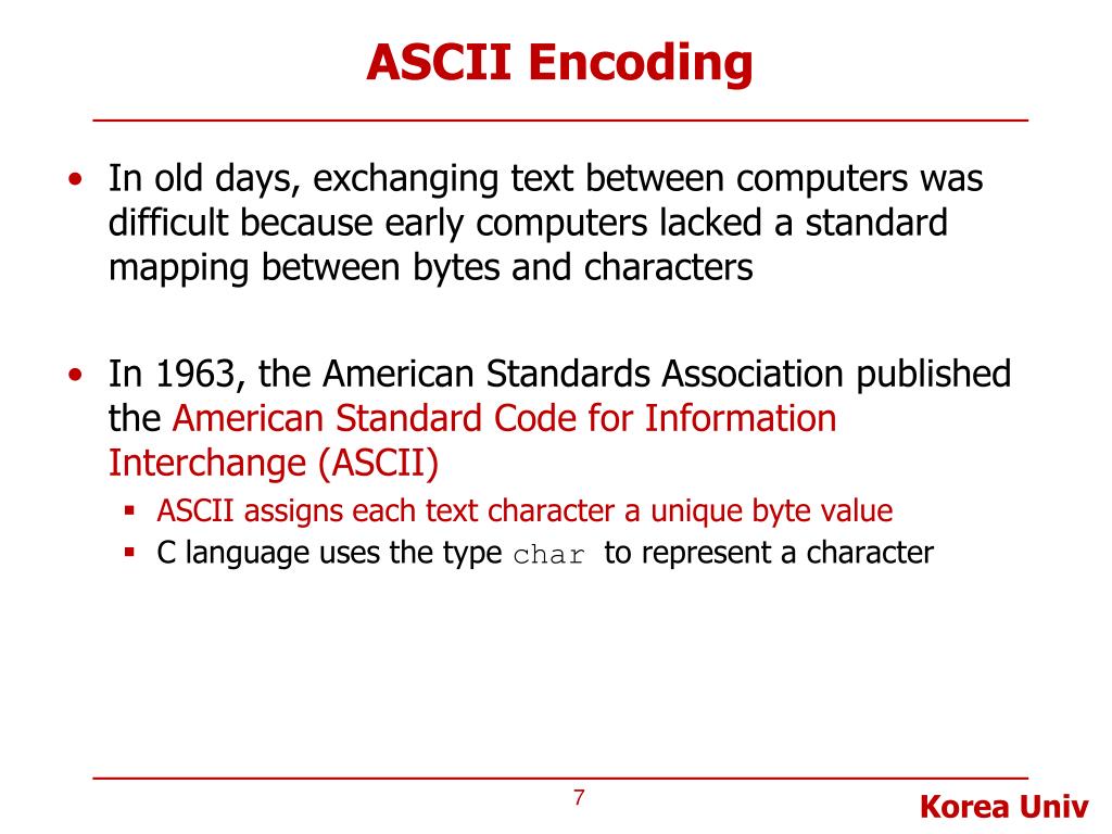 ASCII Encoding • In old days, exchanging text between computers was difficult because early computers lacked a standard mapping between bytes and characters • In 1963, the American Standards Association published the American Standard Code for Information Interchange (ASCII) • ASCII assigns each text character a unique byte value • C language uses the type char to represent a character