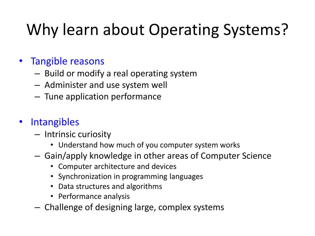 Why learn about Operating Systems? • Tangible reasons • Build or modify a real operating system • Administer and use system well • Tune application performance • Intangibles • Intrinsic curiosity • Understand how much of you computer system works • Gain/apply knowledge in other areas of Computer Science • Computer architecture and devices • Synchronization in programming languages • Data structures and algorithms • Performance analysis • Challenge of designing large, complex systems