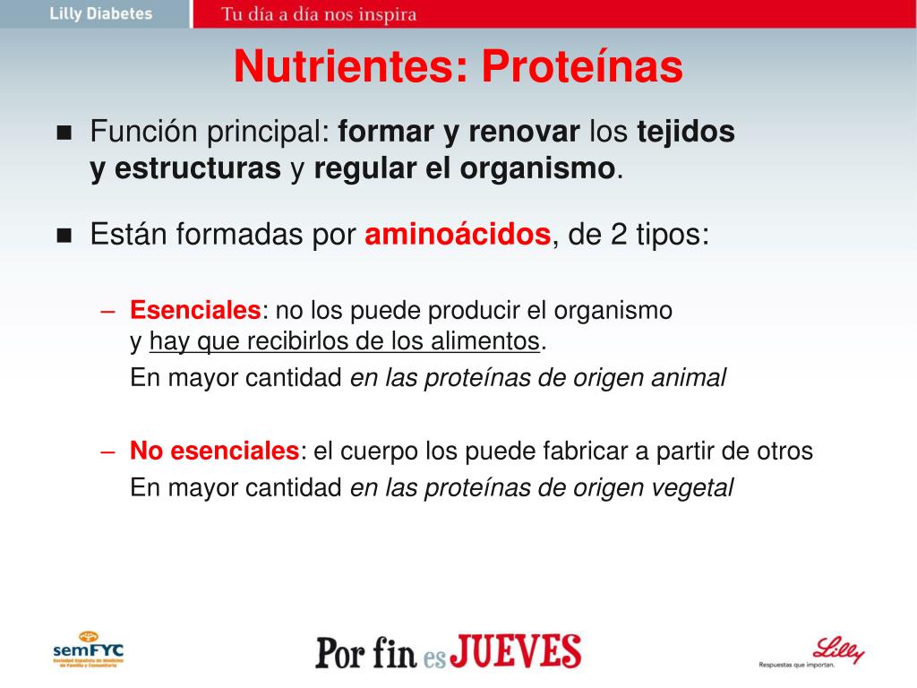 Nutrientes: Proteínas • Función principal: formar y renovar los tejidos y estructuras y regular el organismo. • Están formadas por aminoácidos, de 2 tipos: • Esenciales: no los puede producir el organismo y hay que recibirlos de los alimentos. En mayor cantidad en las proteínas de origen animal • No esenciales: el cuerpo los puede fabricar a partir de otros En mayor cantidad en las proteínas de origen vegetal
